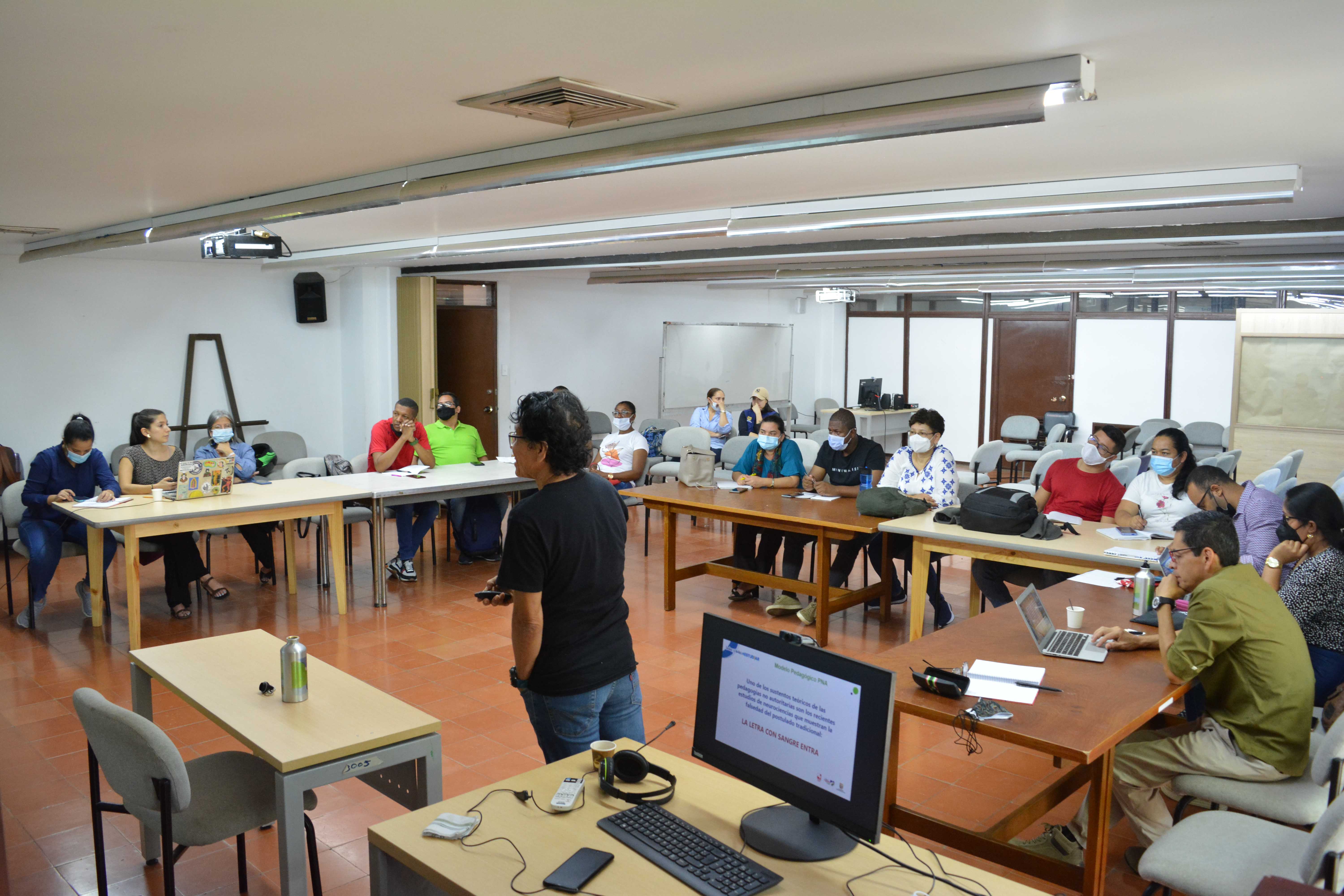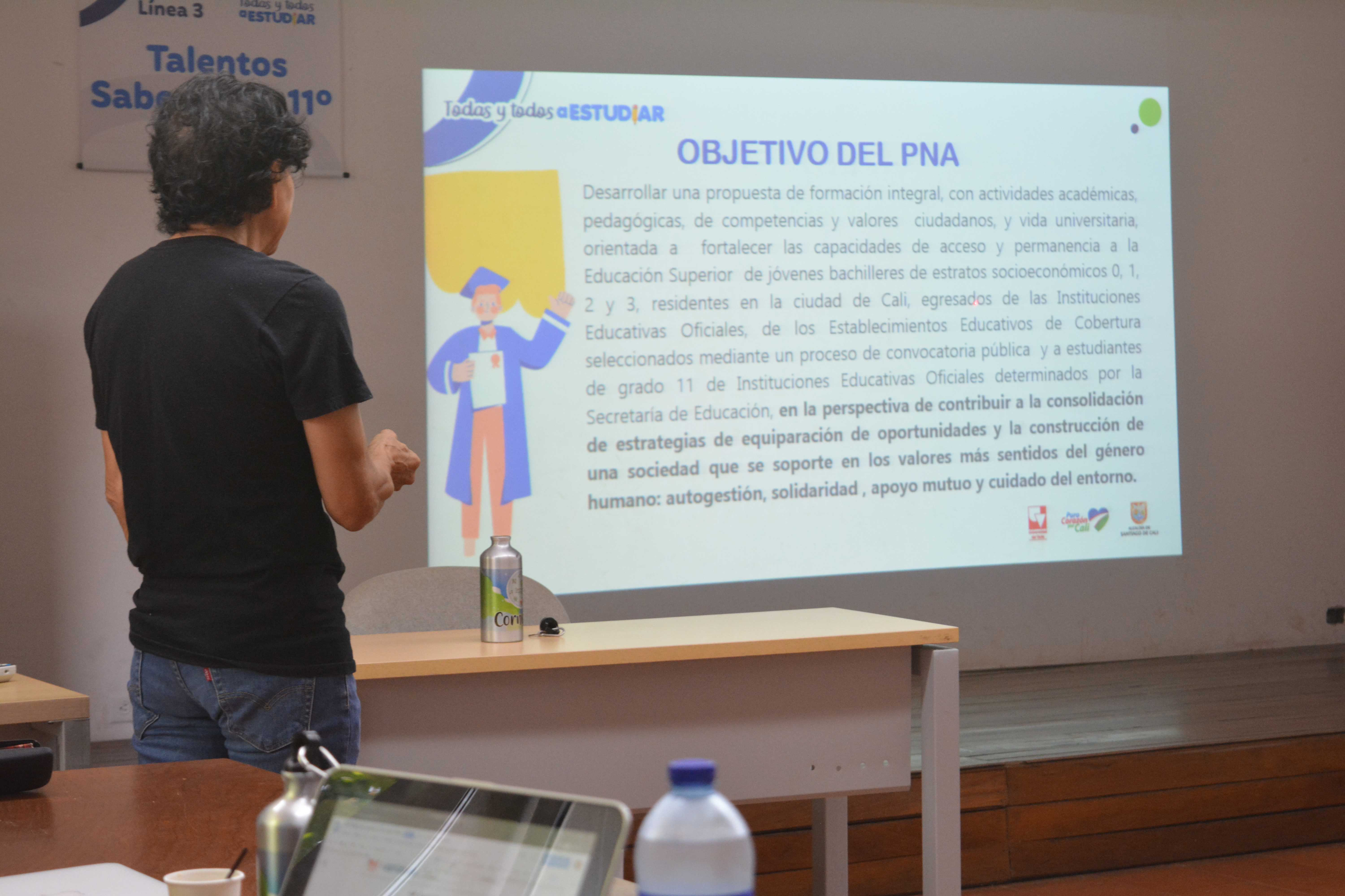 Reunión informativa con docentes de las Instituciones Educativas Oficiales para informarles sobre aspectos académicos del programa Todas y Todos a Estudiar en la Línea 3: Talentos Saber 10º y 11º. El encuentro se realizó en la Sala Baena de la Escuela de Ciencias del Lenguaje, Universidad del Valle – Meléndez.