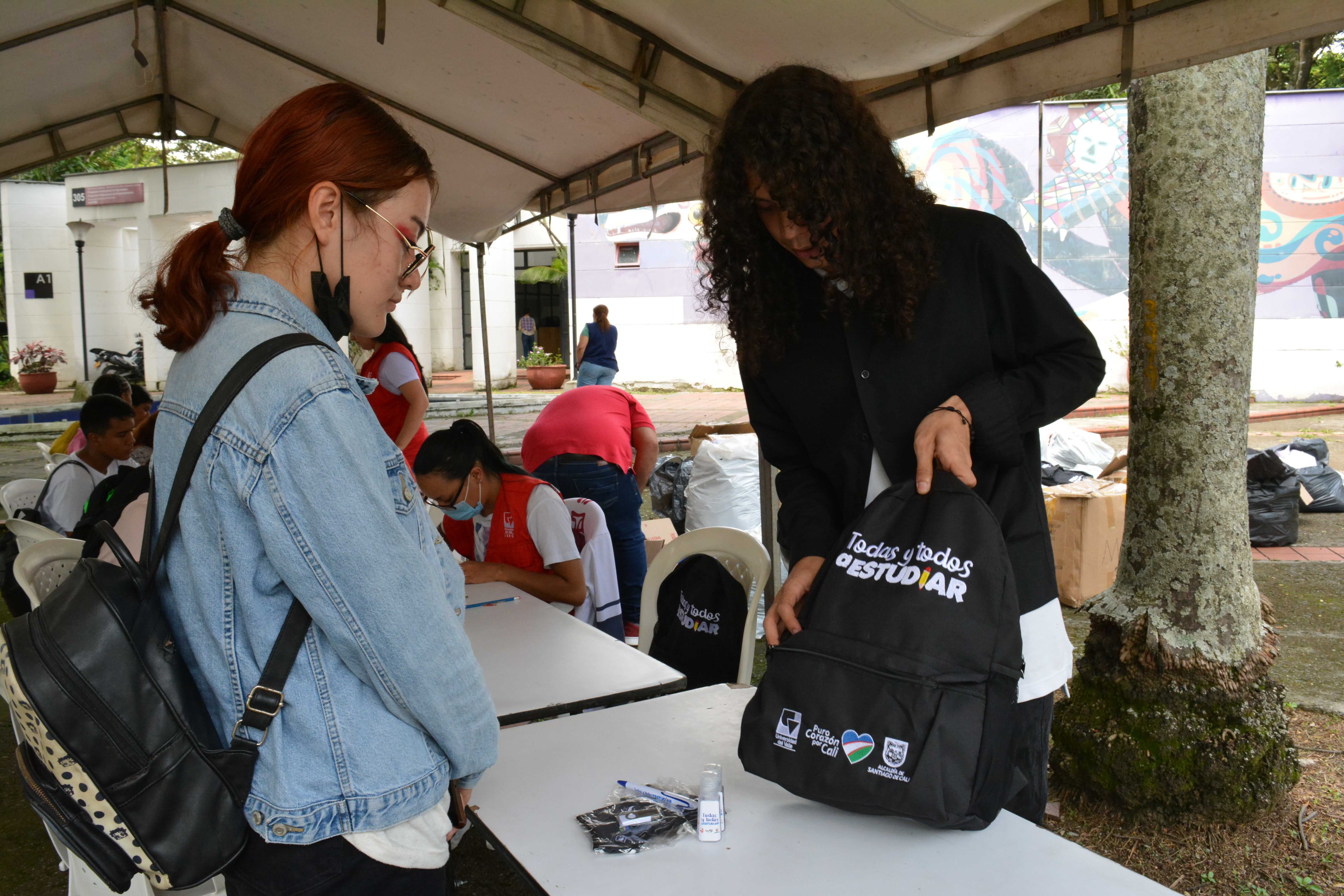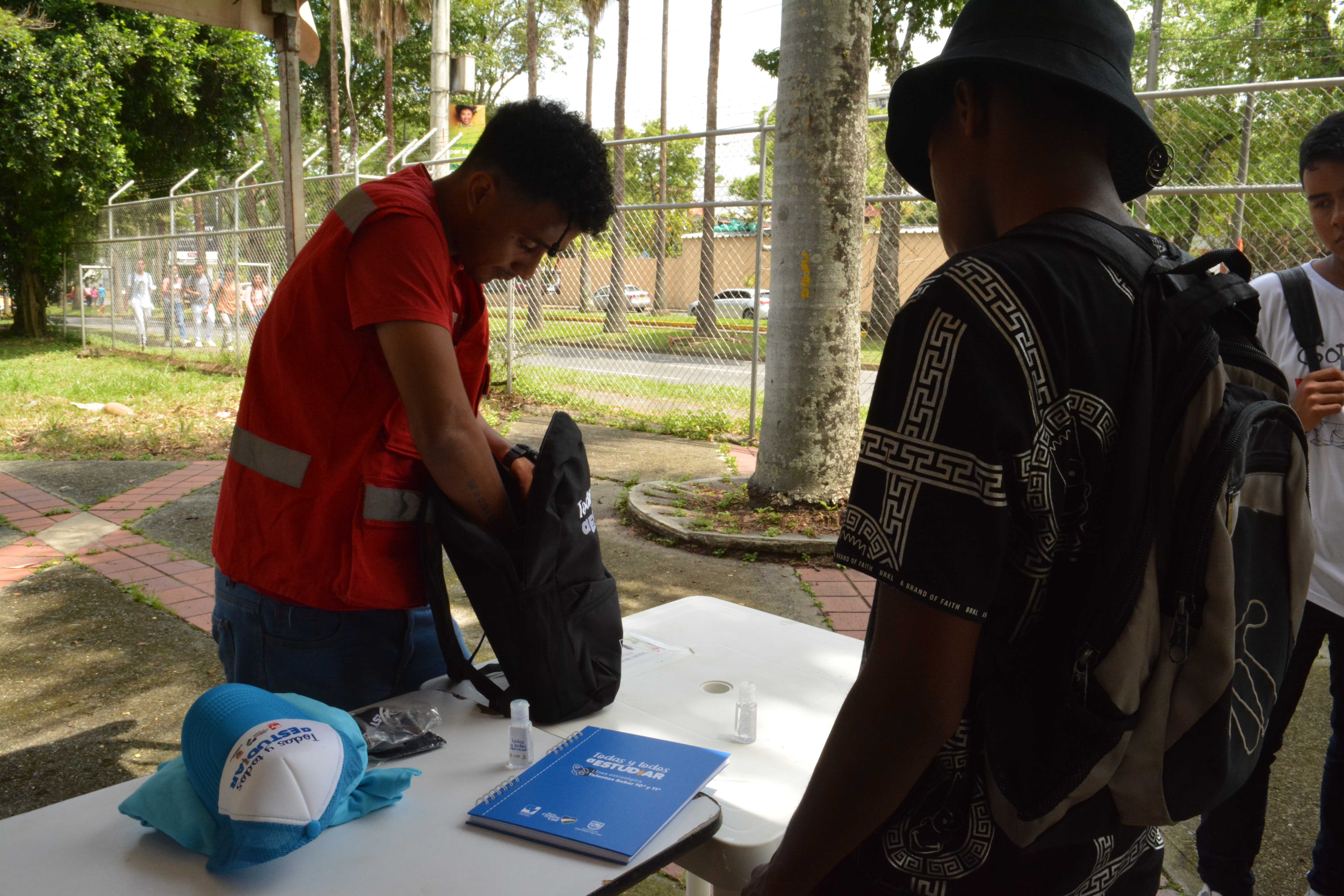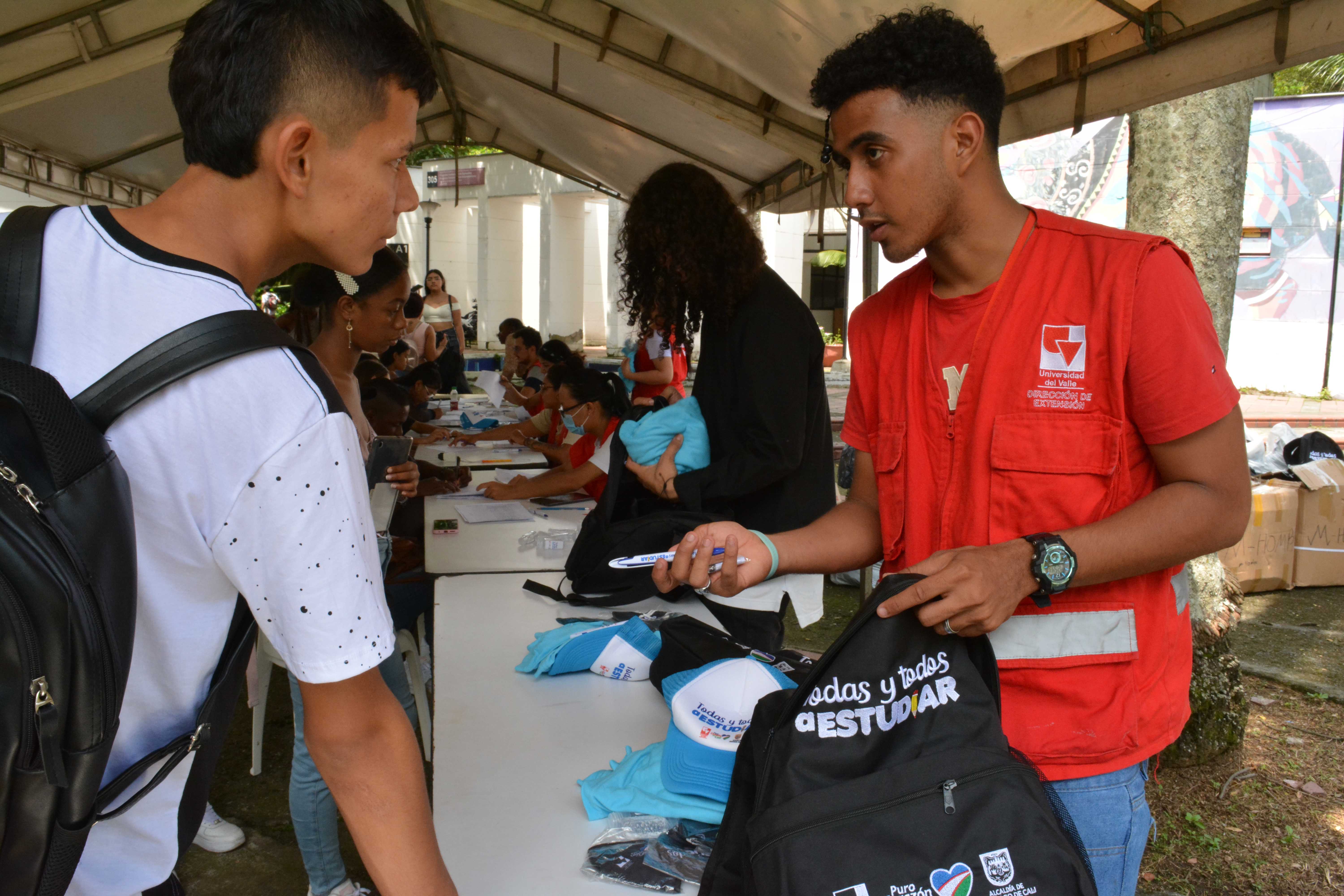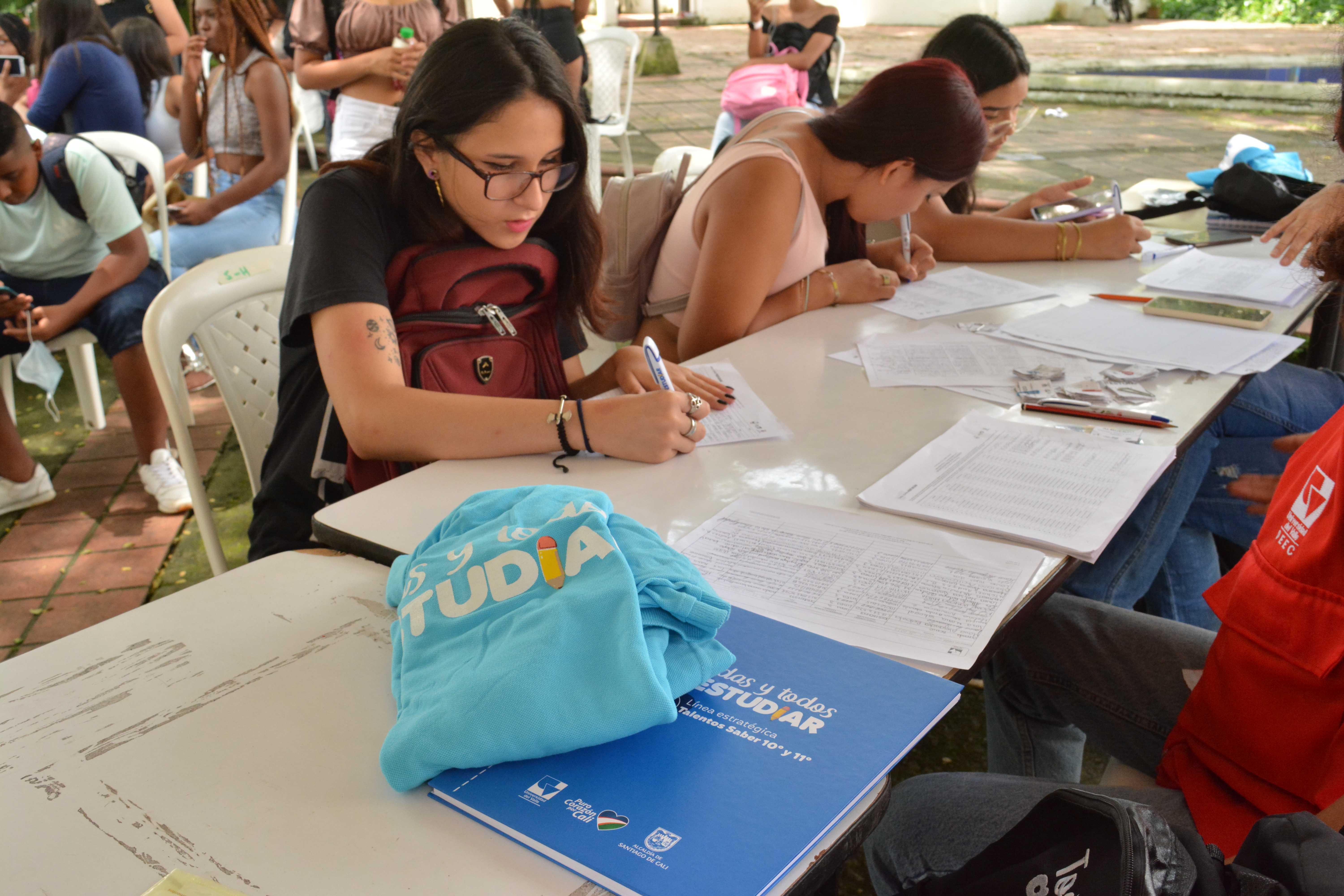 Los beneficiarios de la línea 3: Talentos Saber 10º y 11º, previo a la presentación del simulacro de las Pruebas Saber 11º, reclamando el kit pedagógico en el edificio Ágora de la Universidad del Valle, Meléndez.
