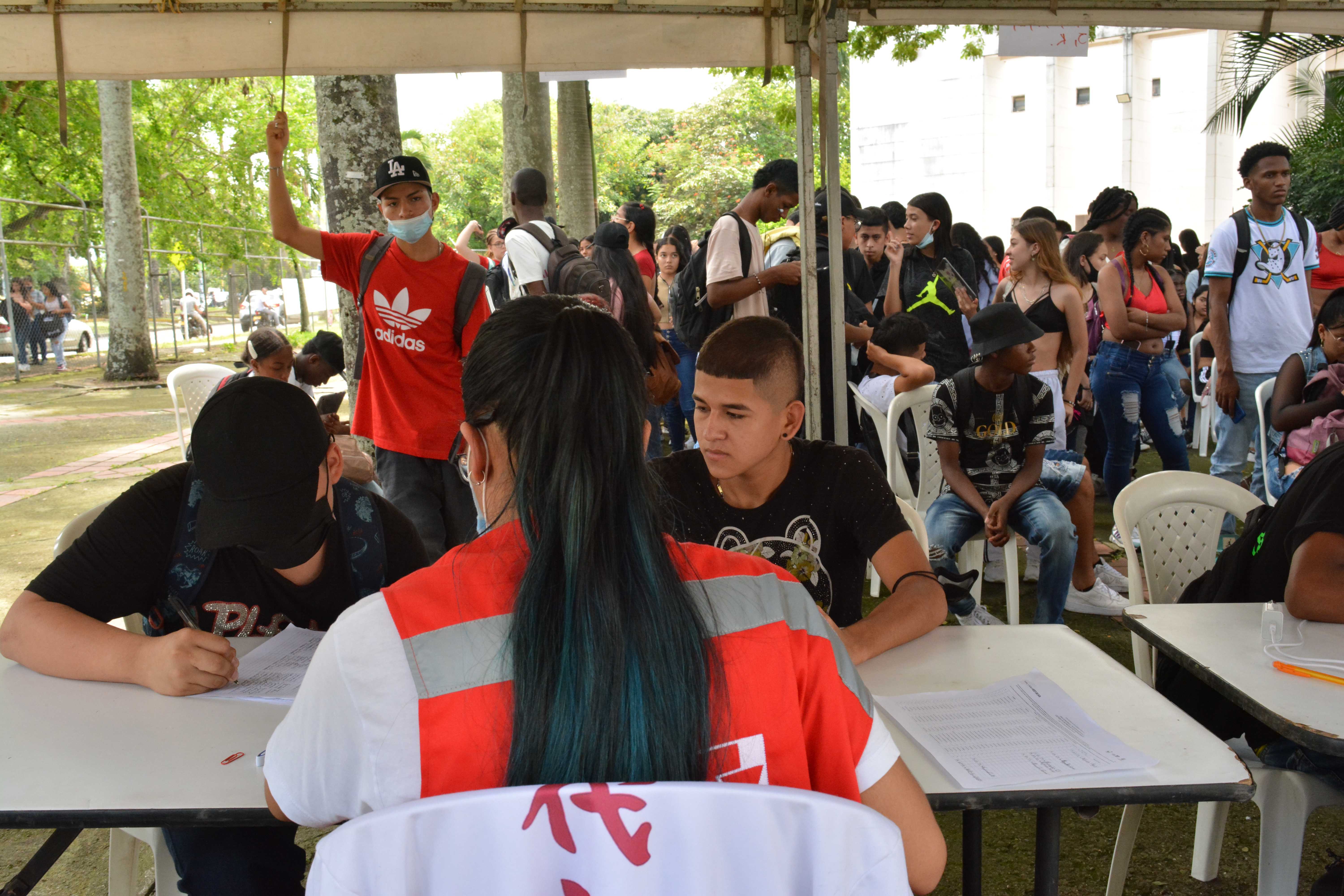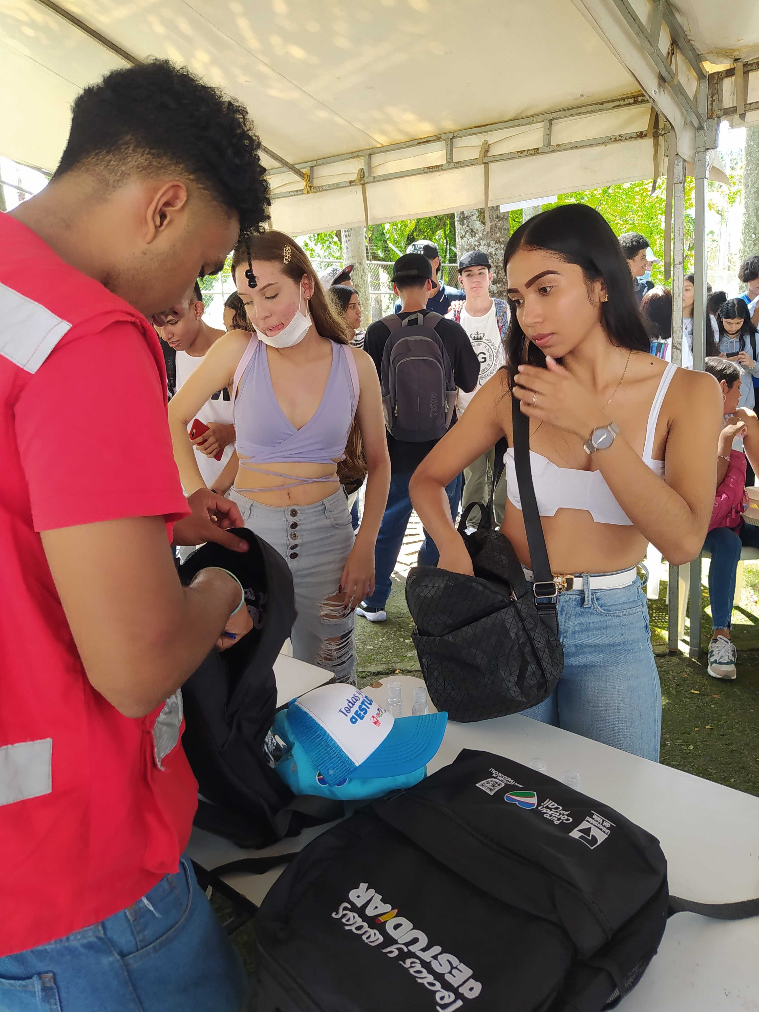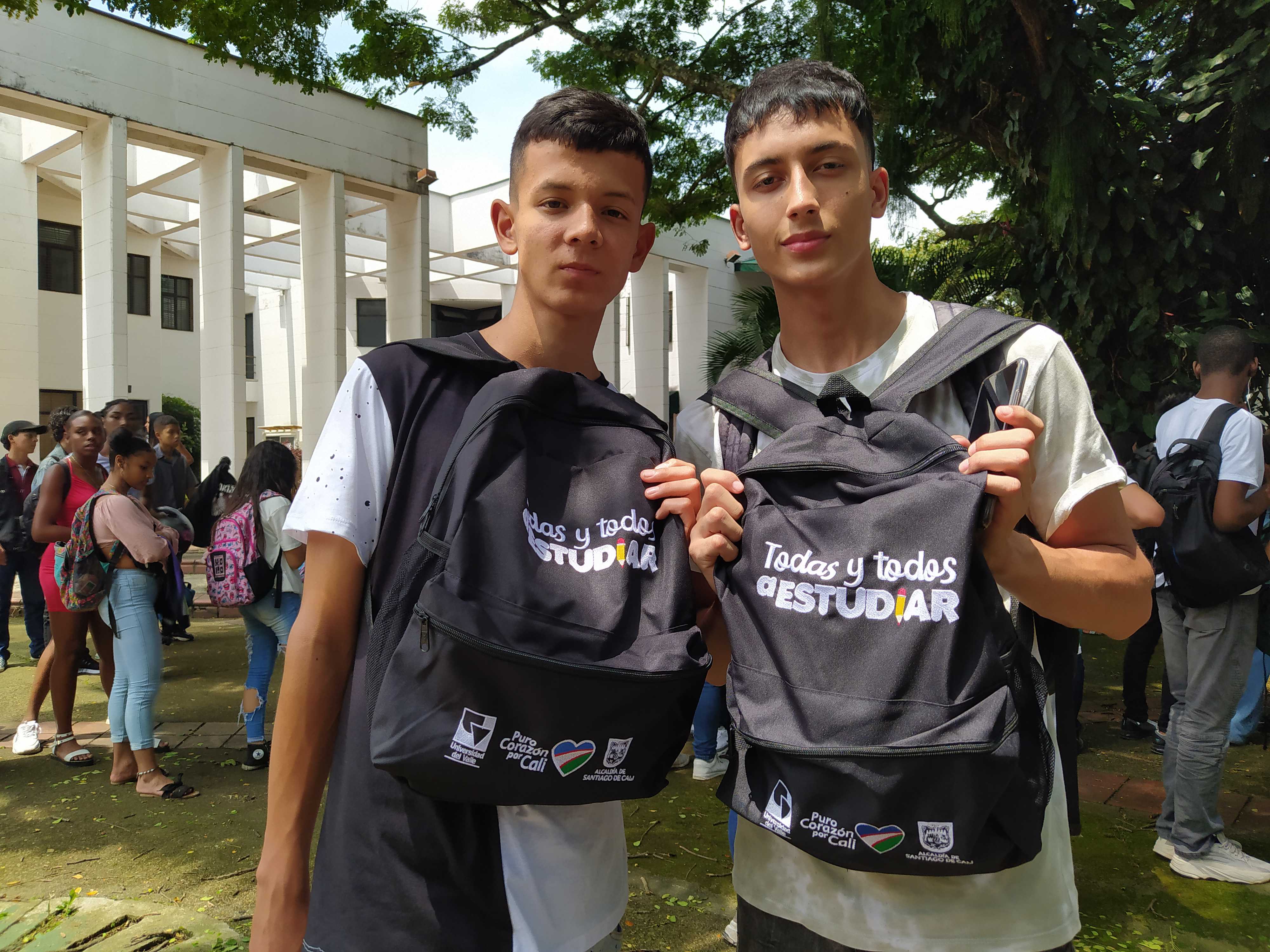 Los beneficiarios de la línea 3: Talentos Saber 10º y 11º, previo a la presentación del simulacro de las Pruebas Saber 11º, reclamando el kit pedagógico en el edificio Ágora de la Universidad del Valle, Meléndez.