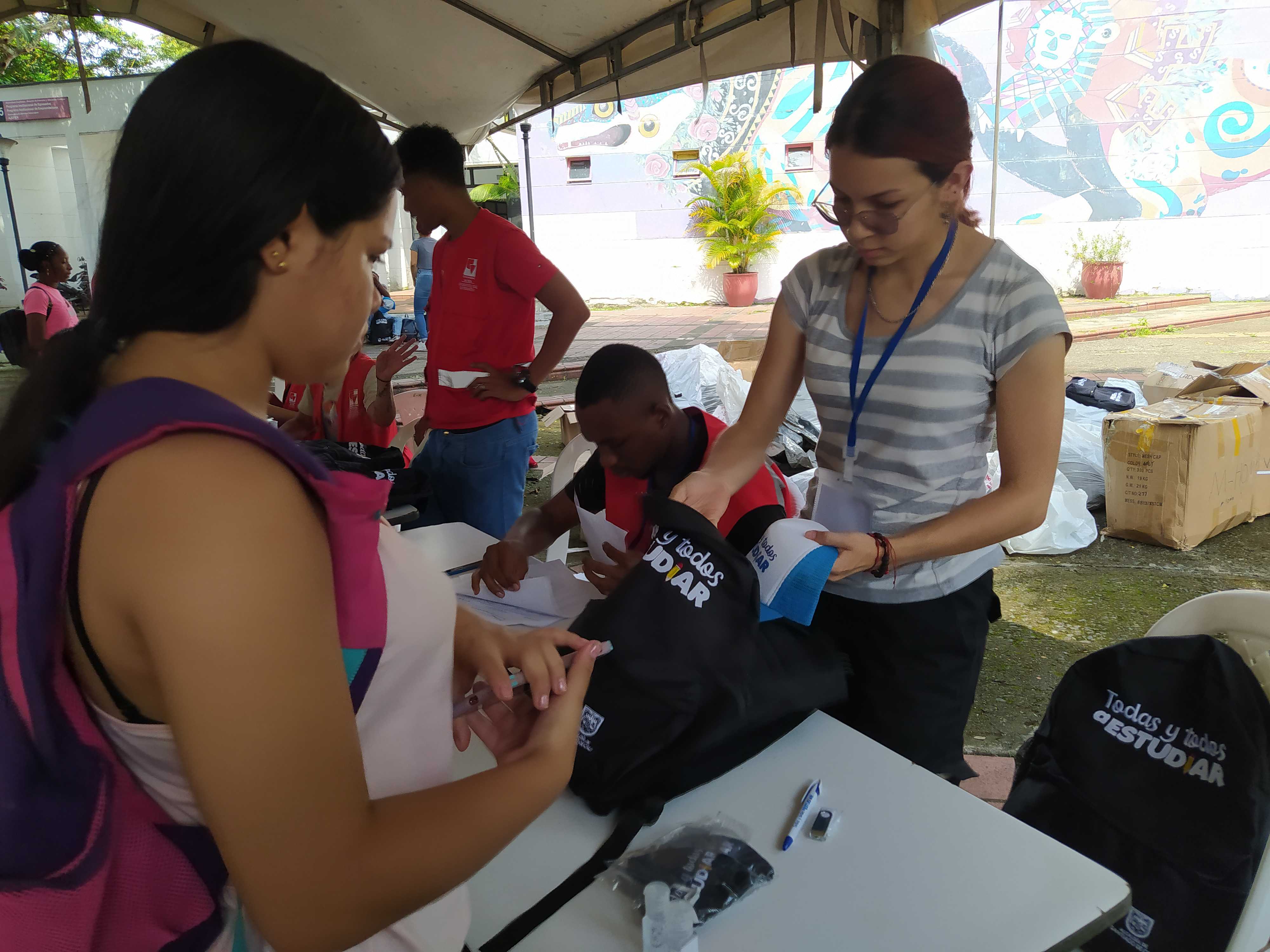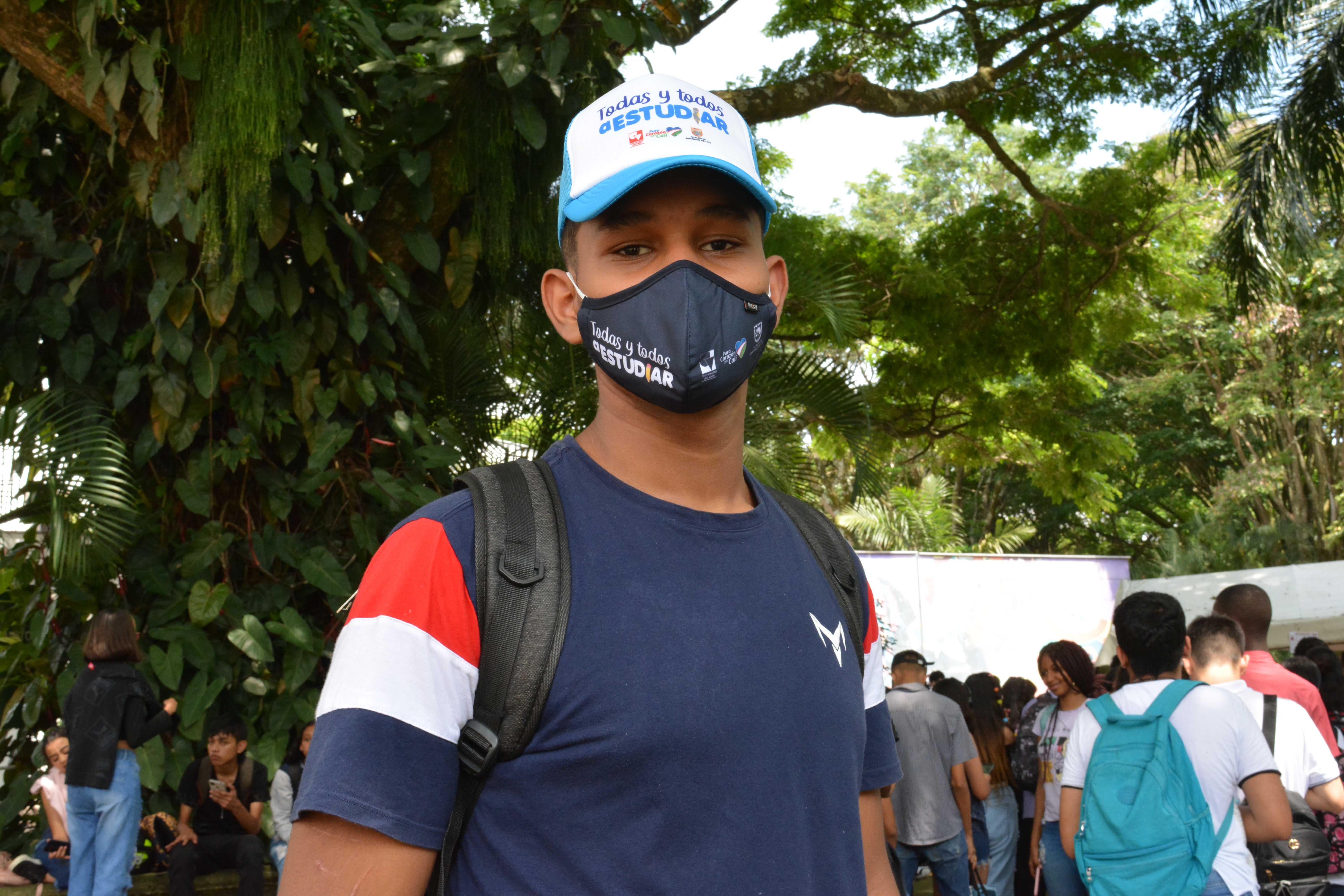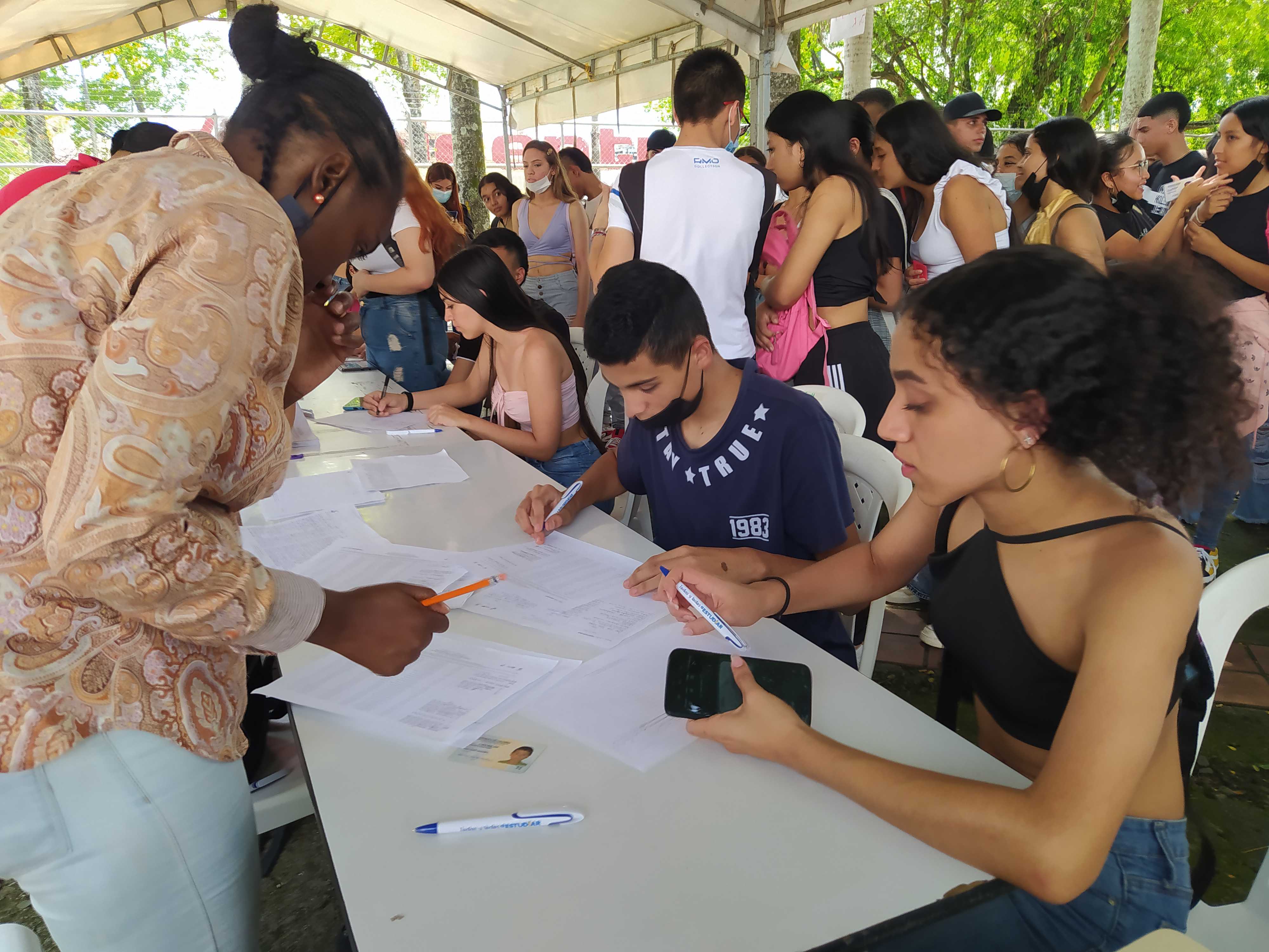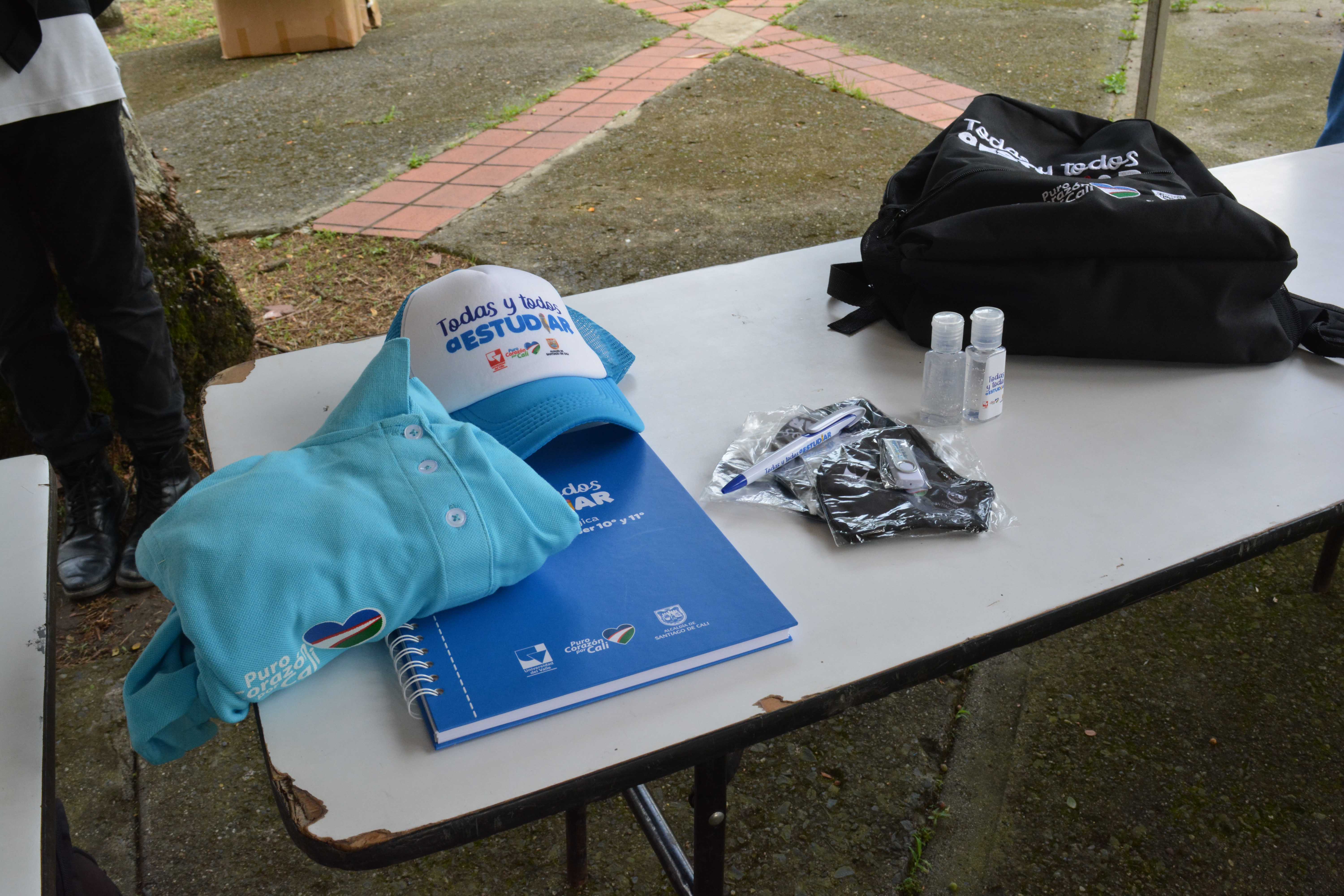 Los beneficiarios de la línea 3: Talentos Saber 10º y 11º, previo a la presentación del simulacro de las Pruebas Saber 11º, reclamando el kit pedagógico en el edificio Ágora de la Universidad del Valle, Meléndez.