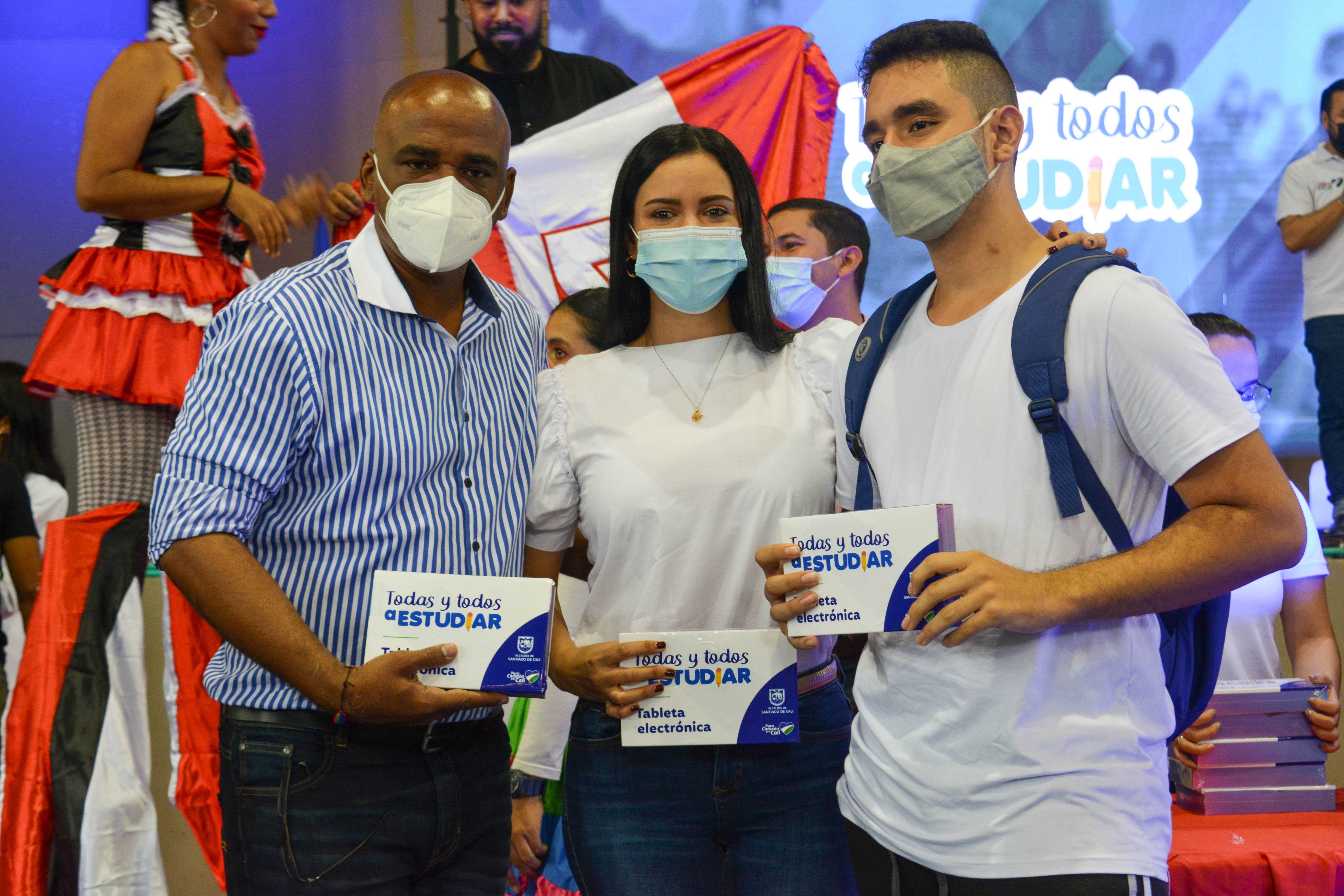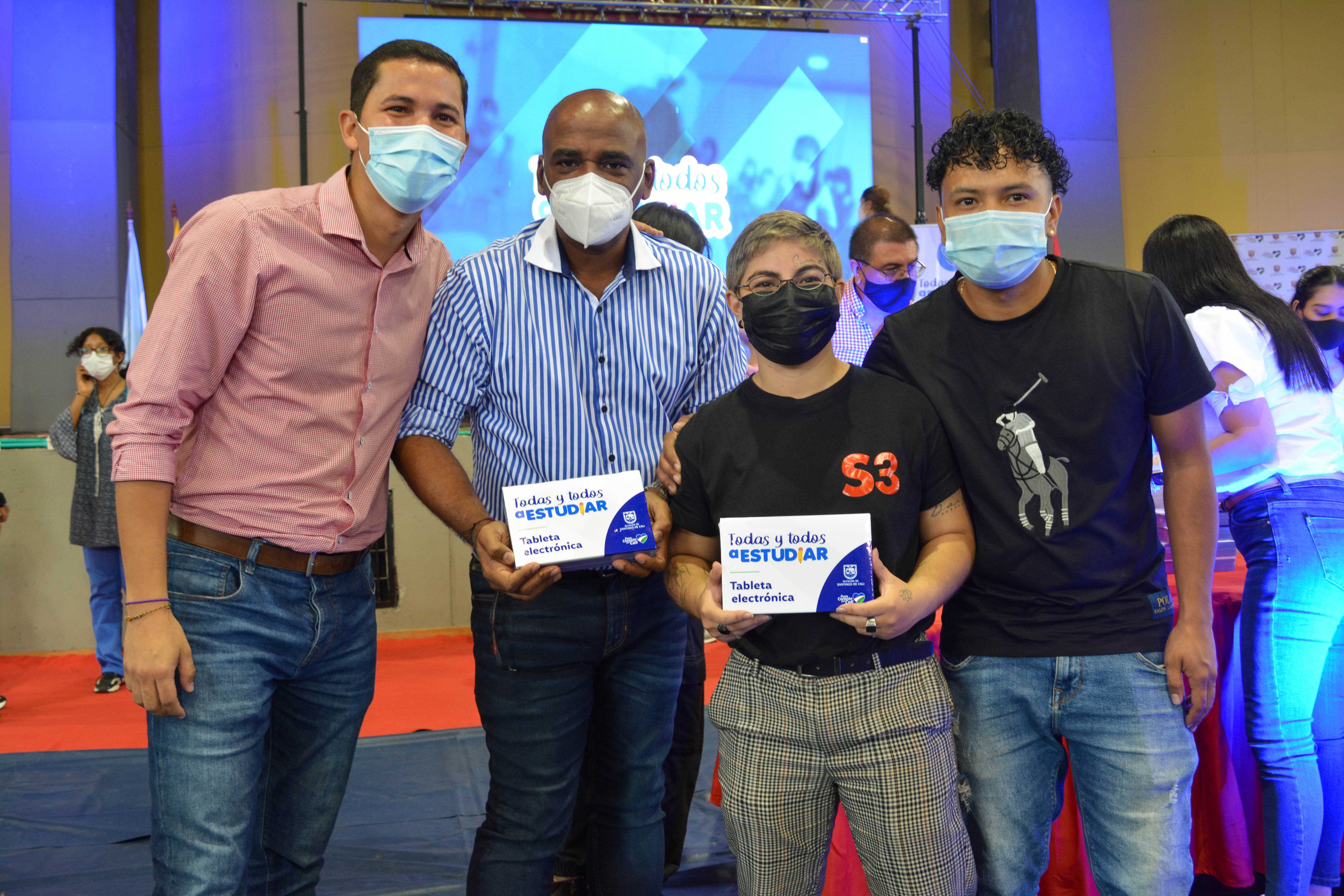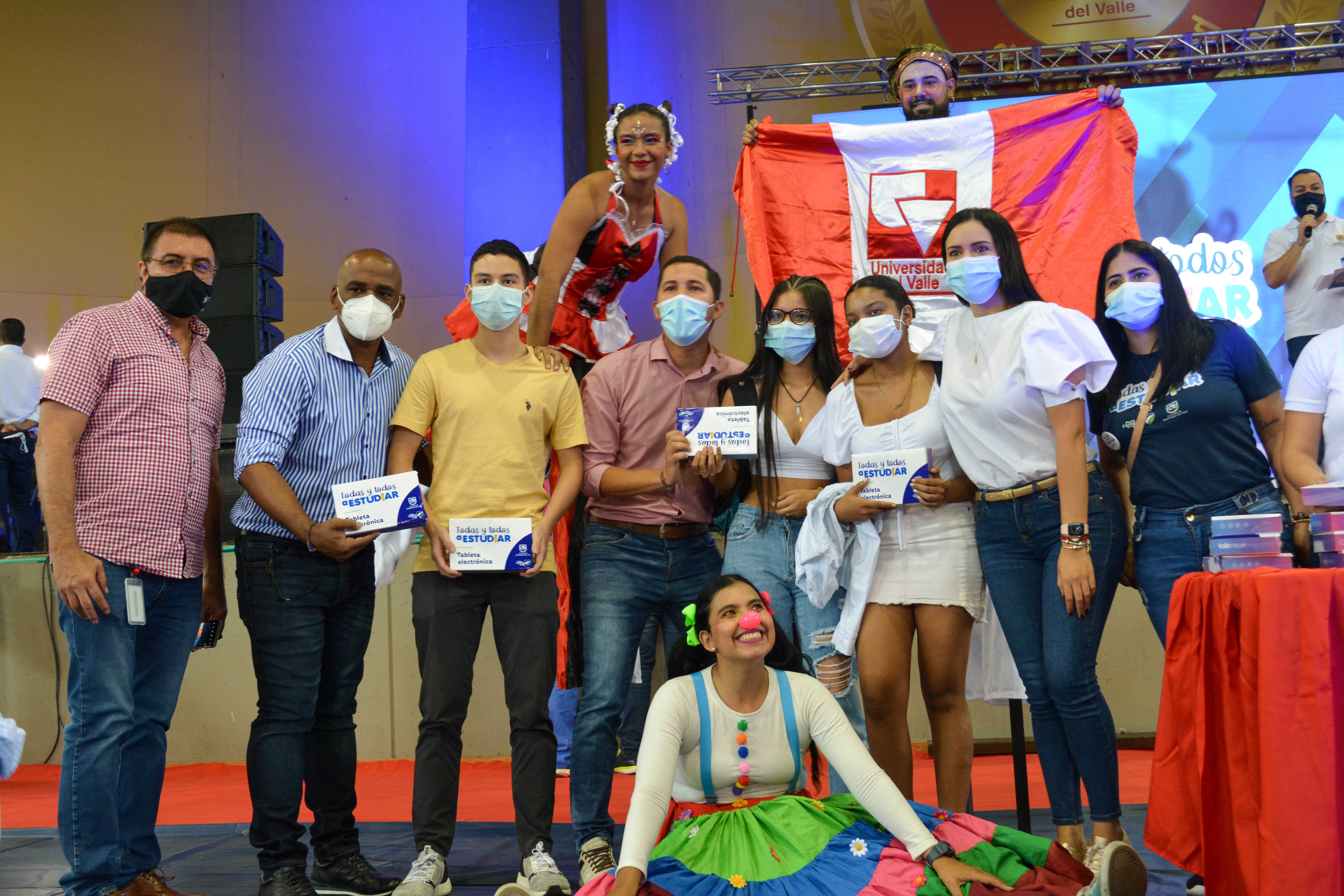 Evento realizado en el Coliseo Alberto León Betancur para la entrega de tabletas electrónicas a los beneficiarios de las líneas 1 y 2. Al evento asistieron por parte de la administración distrital el alcalde de Cali Jorge Iván Ospina, el secretario de educación José Darwin Lenis y la gerente del proyecto Alexandra Monedero. En representación de la Universidad del Valle estuvo presente la vicerrectora académica Liliana Arias Castillo, la directora de Extensión y Educación Continua Sandra Liliana Cano Montoya y la jefe de la sección de Salud Ocupacional Patricia Andrea Martos Guatusmal.
