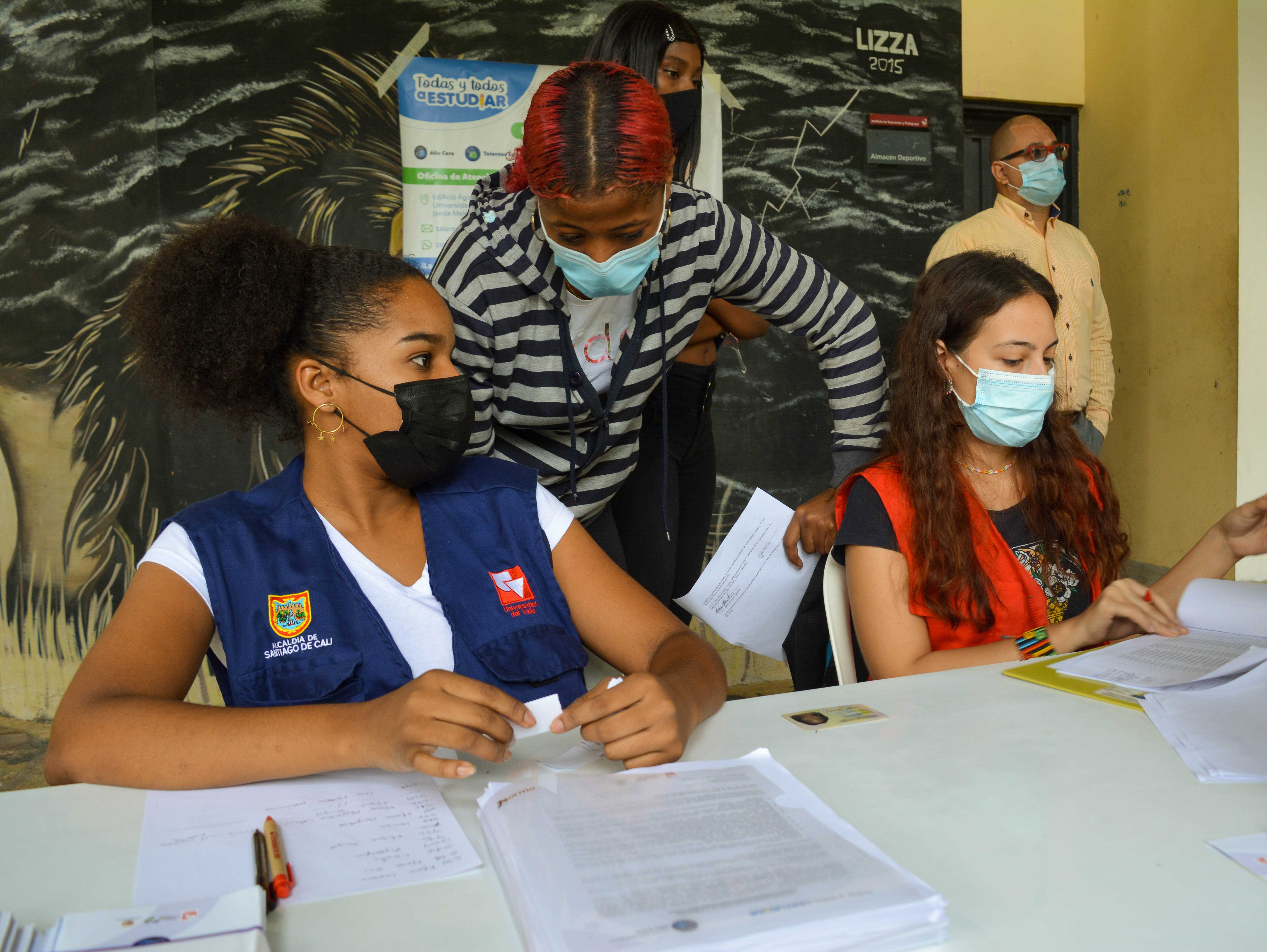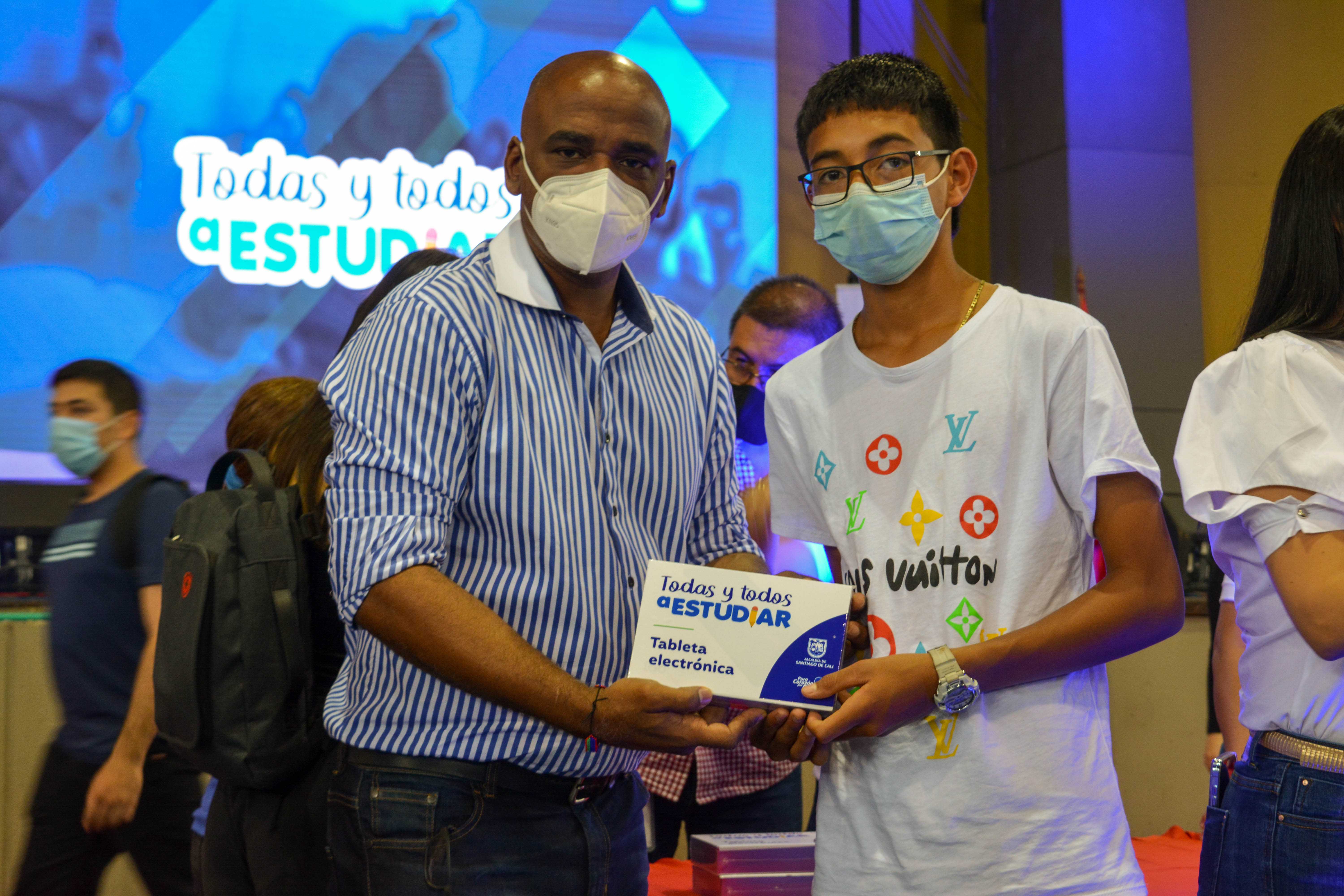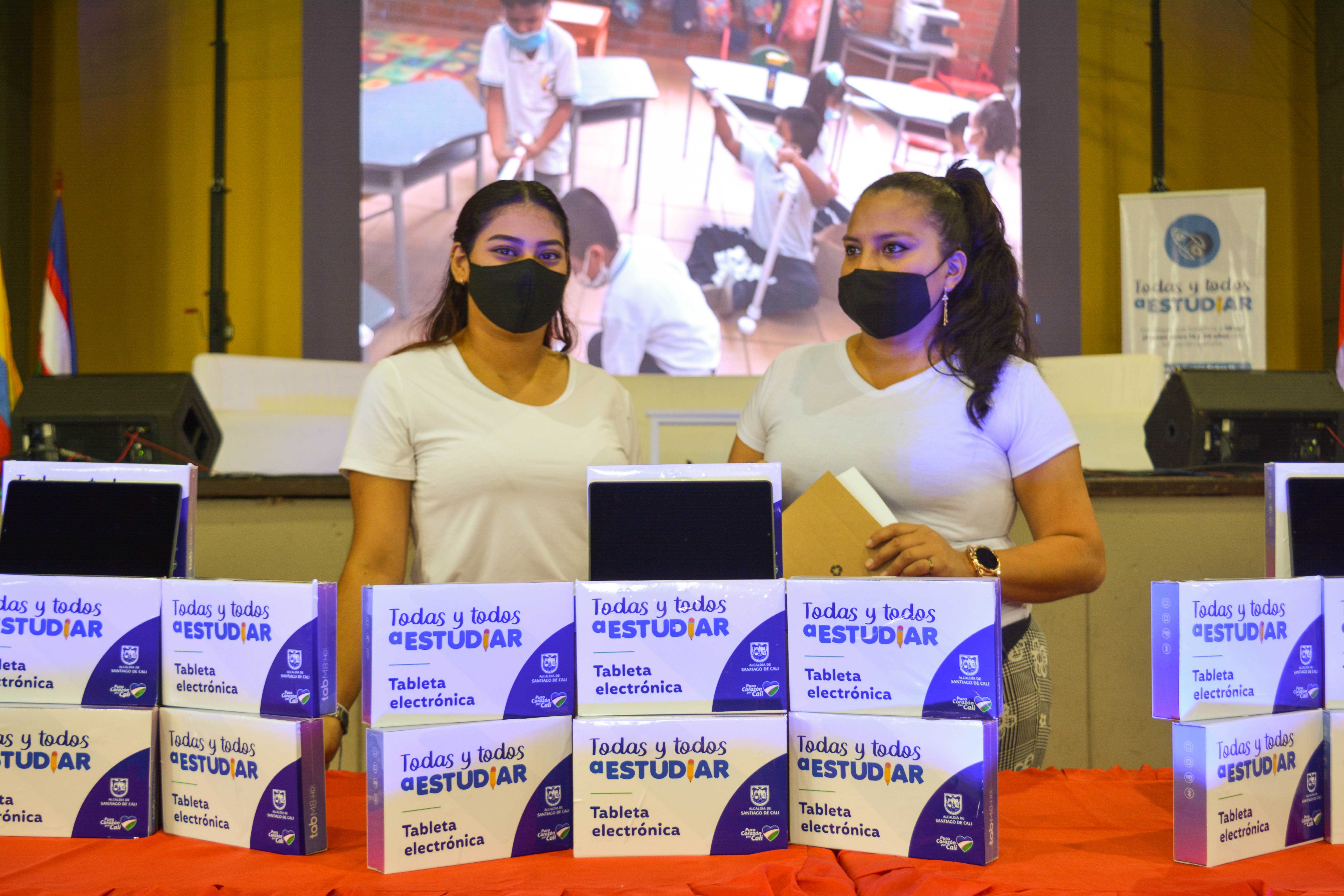 Evento realizado en el Coliseo Alberto León Betancur para la entrega de tabletas electrónicas a los beneficiarios de las líneas 1 y 2. Al evento asistieron por parte de la administración distrital el alcalde de Cali Jorge Iván Ospina, el secretario de educación José Darwin Lenis y la gerente del proyecto Alexandra Monedero. En representación de la Universidad del Valle estuvo presente la vicerrectora académica Liliana Arias Castillo, la directora de Extensión y Educación Continua Sandra Liliana Cano Montoya y la jefe de la sección de Salud Ocupacional Patricia Andrea Martos Guatusmal.